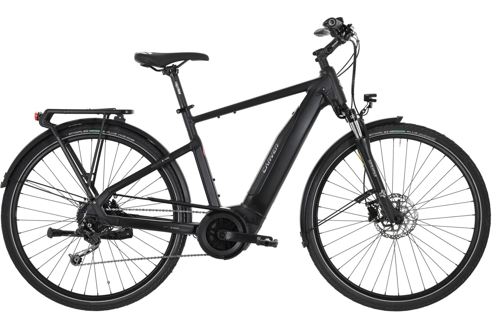 Das fängt bei den 28″ Laufrädern an und endet beim schicken Diamant Rahmen aus Aluminium. Für den nötigen Vortrieb sorgt dabei ein kräftiger Bosch Active Line Plus Mittelmotor mit 50 Nm Drehmoment. Damit der Spaß kein jähes Ende findet, setzt Carver auf einen großzügigen 400 Wh Intube-Akku. Dieser bietet selbst für lange Ausfahrten genug Saft.Das Carver Route E.410 ist ein sehr durchdachtes und sinnig ausgestattetes E-Trekkingbike.
