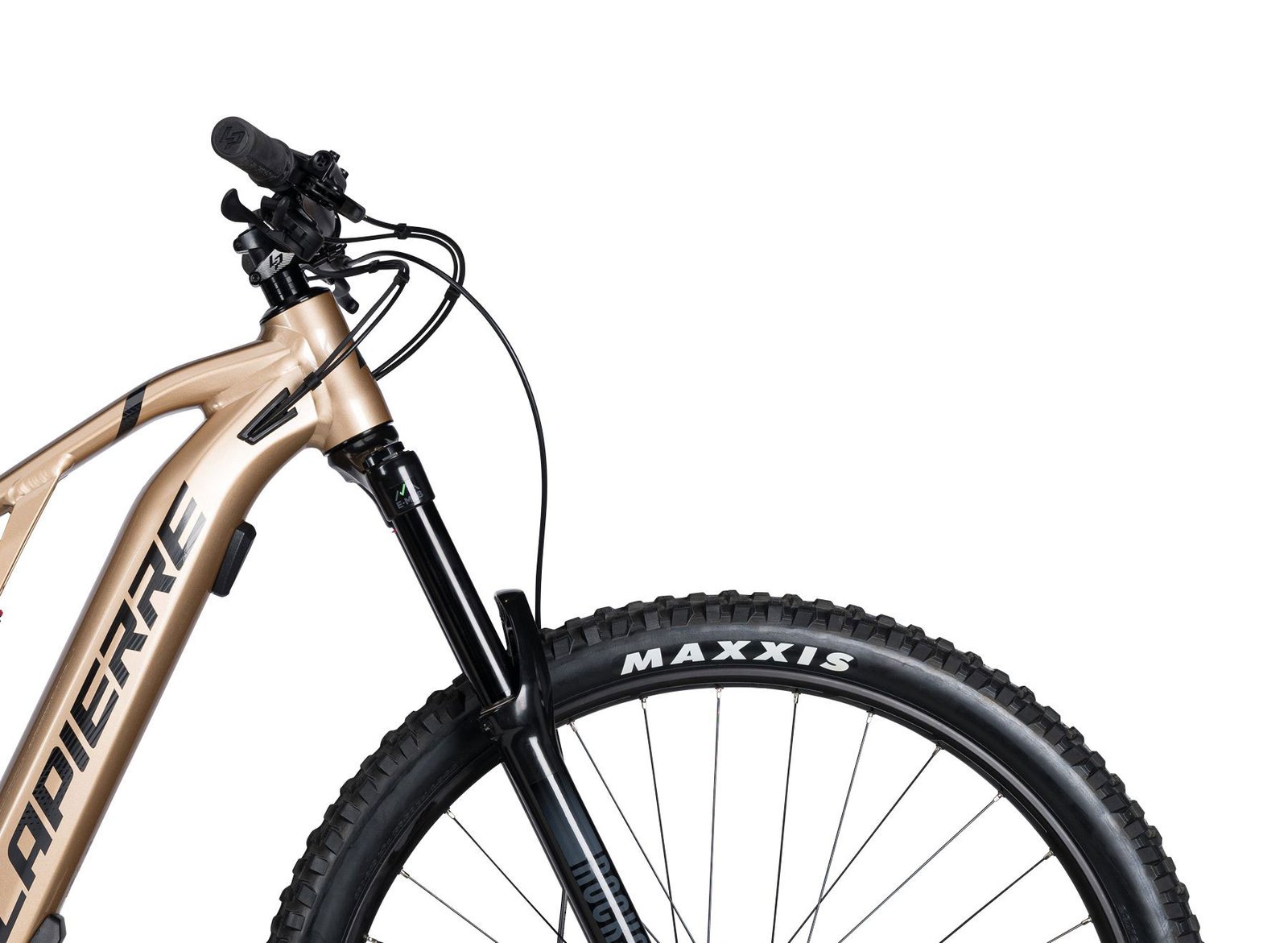 Eine Besonderheit beim Lapierre Overvolt AM ist der Laufradsatz: dieser kommt vorne mit 29“ und hinten mit 27,5“. Dieser Laufrad-Mix, auch „Mullet“ genannt, soll das Beste aus beiden Welten vereinen. Zum einen die Wendigkeit, für die Mountainbikes mit 27,5“ bekannt sind, zum anderen bessere Traktion und ein gutes Überrollverhalten, was für die größeren 29“ Räder typisch ist. Das Fahrwerk des All Mountain E-MTBs besteht aus RockShox 35 Gold RL Gabel und Lapierre Dämpfer, beide mit 160 mm Federweg. Für perfekte Bremsperformance sorgt die Shimano M4100 Bremse mit 4 Kolben. Den optimalen Grip auf den Trail bringen die breiten Maxxis Reifen, vorne mit einer Breite von 2,5“, hinten mit 2,8“.