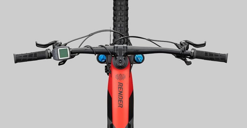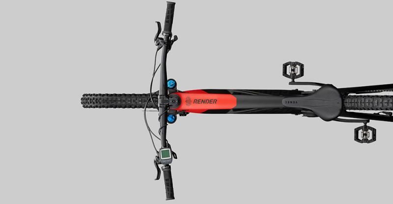 Eine abnehmbare Kunststoffklappe schließt das Unterrohr ab und ermöglicht bei Bedarf die Entnahme des Akkus. Für den Ladevorgang ist das jedoch nicht nötig, denn der Rahmen verfügt im Sitzrohr über eine externe Ladebuchse. Integriert in den Steuersatz ist der Block Lock, eine Vorrichtung, die das Einschlagen der Gabel in den Rahmen im Falle eines Sturzes, verhindert. Das RENDER verfügt über 160mm Federweg an der Front und 140mm am Heck und nimmt Reifen bis zu 2.6″ Breite auf.