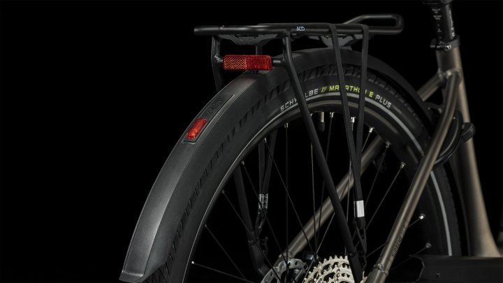 Dank RockShox Paragon Gold Luftfedergabel, 50mm breiten Schwalbe Marathon E-Plus Reifen und gefederter Sattelstütze können ihm selbst raueste Straßenbeläge in der City nichts anhaben. Und die hydraulischen Shimano Scheibenbremsen vermitteln zu jeder Zeit Sicherheit und Kontrolle. Eine Vollausstattung mit praktischem Zubehör – Seitenständer, Lichter, Schutzbleche und ein semi-integrierter Gepäckträger – rundet diesen City-Allrounder gekonnt ab.