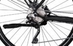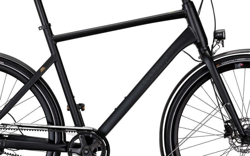 Das RABENEICK TC-E TRAPEZ, bei dem nur ganz kleine Details verraten, dass das TC-E ein E-Bike ist. Der Hinterrad-Antrieb ist ähnlich groß wie ein Nabendynamo, der Akku komplett im Unterrohr integriert und die Ladebuchse vor Schmutz und Witterung geschützt über dem Tretlager versteckt.